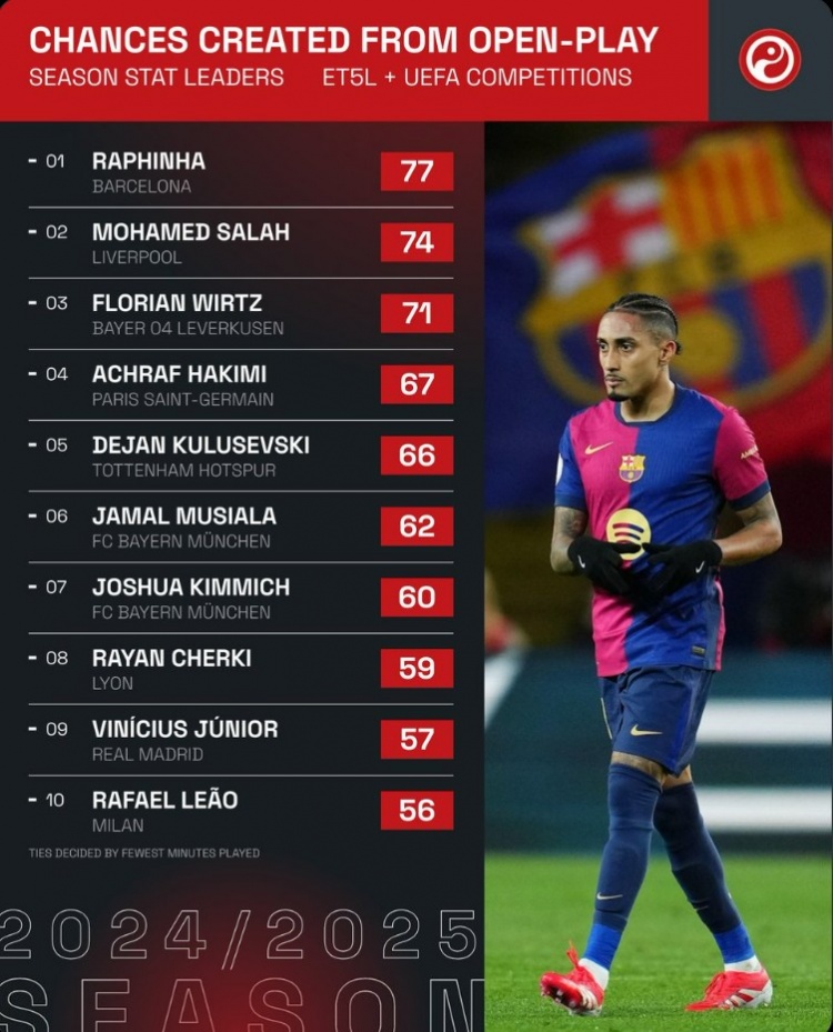 3月3日訊數(shù)據(jù)網(wǎng)站Squawka盤點了本賽季五大聯(lián)賽球員在聯(lián)賽以及歐戰(zhàn)比賽中,運動戰(zhàn)創(chuàng)造機會榜,其中拉菲尼亞居首,薩拉赫次席,具體如下: