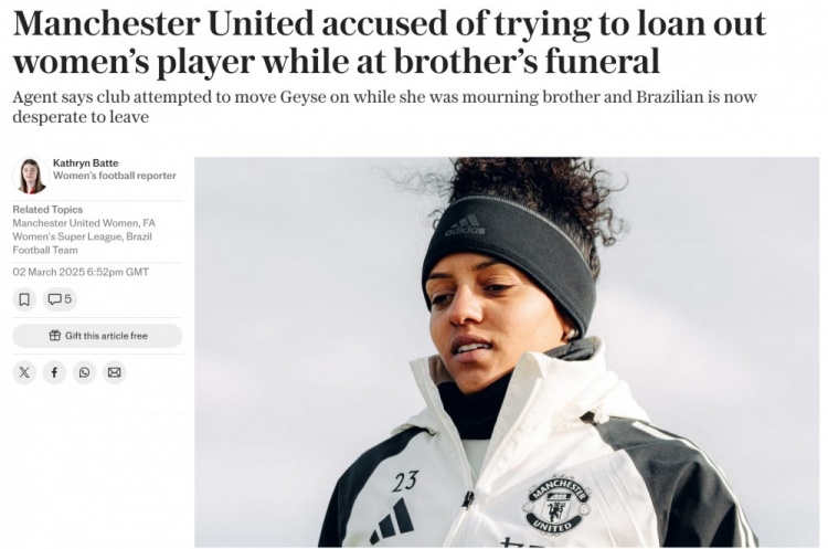 巴西女足球員蓋斯在2023年以創(chuàng)紀(jì)錄的轉(zhuǎn)會費從巴塞羅那轉(zhuǎn)會曼聯(lián),但現(xiàn)在,她在俱樂部過得并不開心,想要離開。蓋斯的經(jīng)紀(jì)人路易斯-費利佩-席爾瓦告訴《電訊報》,球員在一月份回巴西參加去世哥哥的葬禮時,曼聯(lián)曾試圖將她租借到美國的俱樂部。
