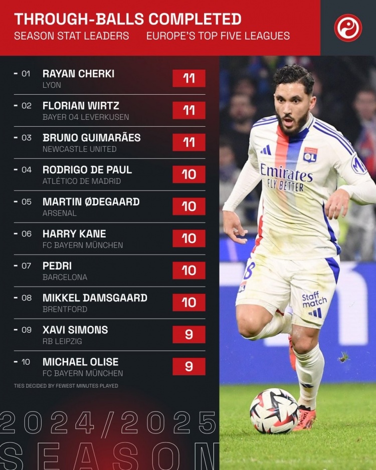 本賽季五大聯(lián)賽精準(zhǔn)直塞榜: