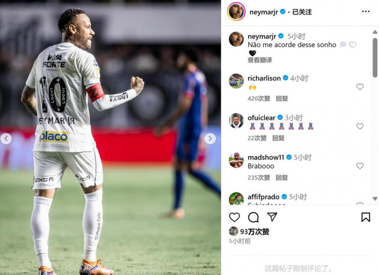 本場比賽內(nèi)馬爾任意球破門,在加盟桑托斯以來7場比賽3球3助攻。賽后內(nèi)馬爾也在個人社媒曬出本場慶祝照片,配文寫道:“不要把我從夢中叫醒?!?/span>