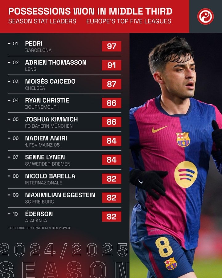 又嫩又狠!佩德里97次在中場搶回球權(quán),冠絕五大聯(lián)賽