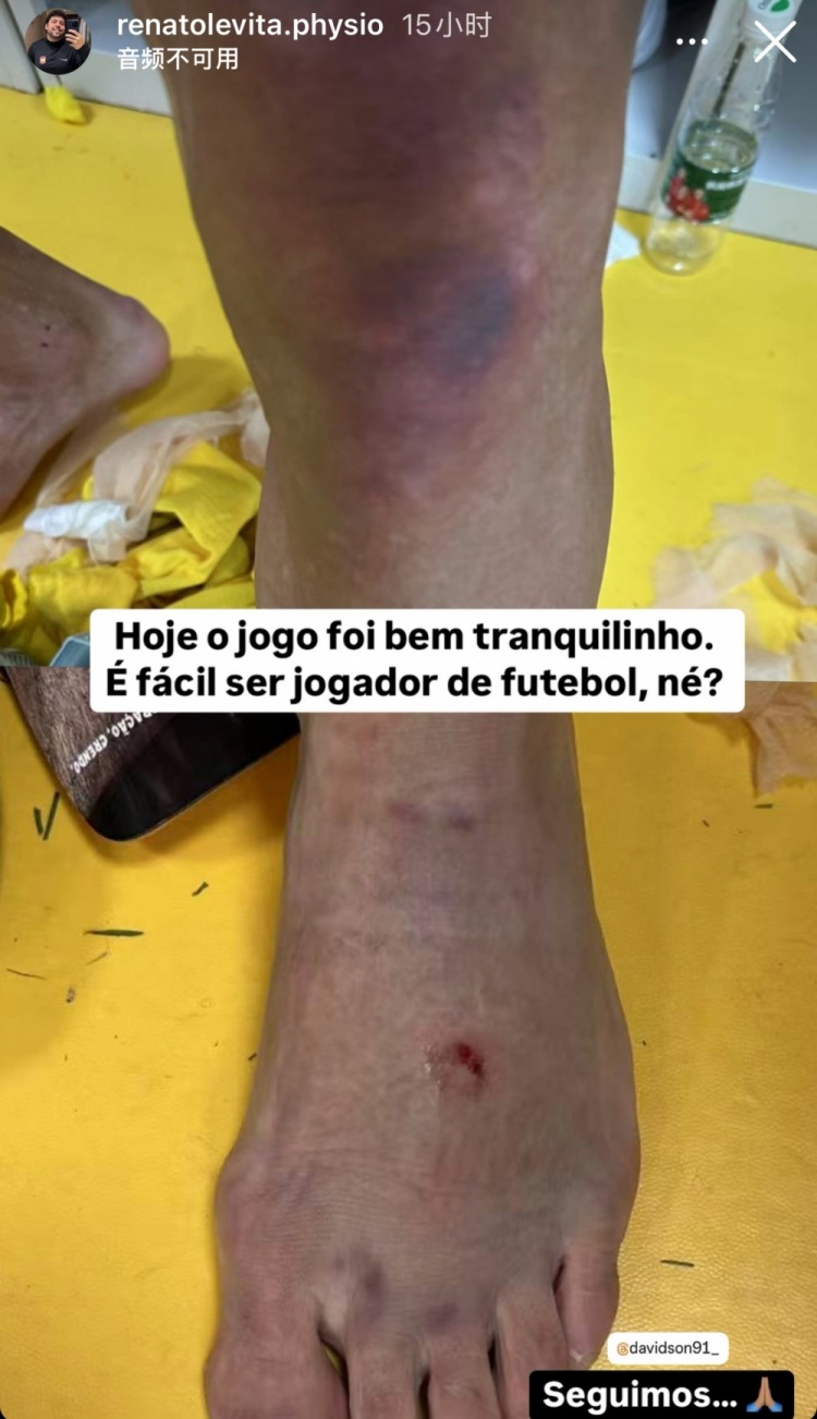 本場比賽戴維森打滿全場,作為西海岸核心球員的他,自然也得到了三鎮(zhèn)隊的重點“關(guān)照”。從西海岸理療師社媒曬出的照片可以看到,一場比賽下來,戴維森的腿部已是傷痕累累,西海岸理療師為此配文寫道:“一場平靜的比賽。當(dāng)足球運動員很容易,對吧?”