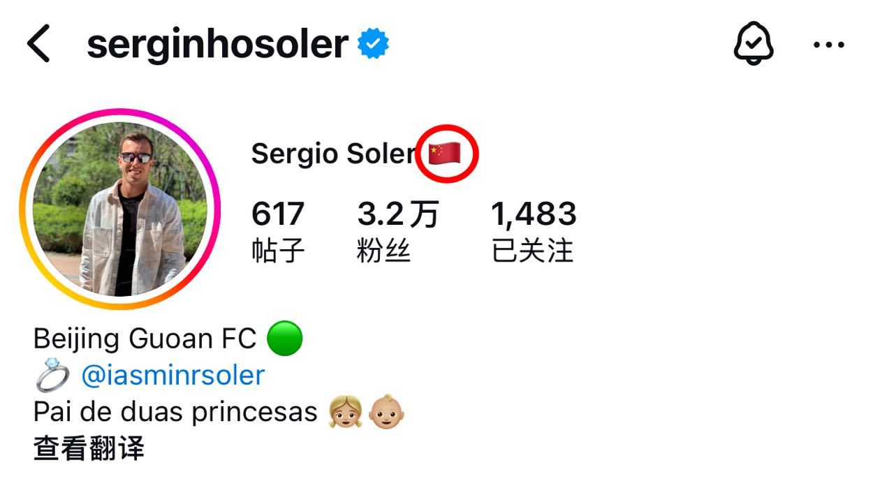 3月登場?塞爾吉尼奧社媒已加上中國國旗