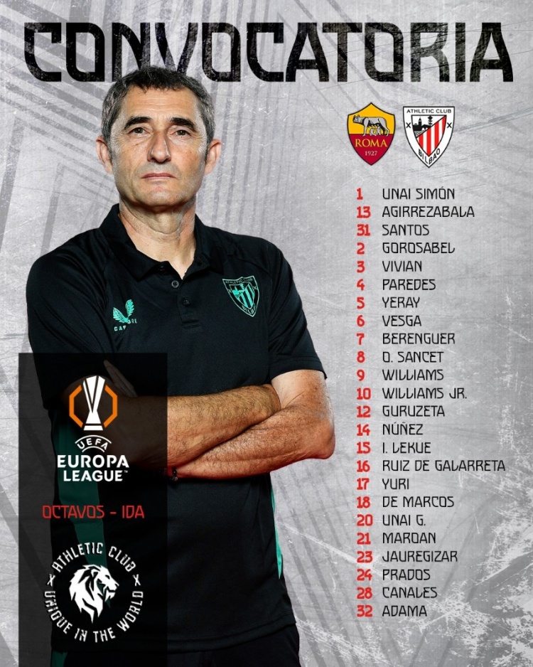 3月4日訊 北京時間3月7日凌晨4:00,歐聯(lián)杯1/8決賽首回合,畢爾巴鄂競技將客戰(zhàn)羅馬。賽前,畢爾巴鄂競技官方公布了本場比賽球隊大名單。