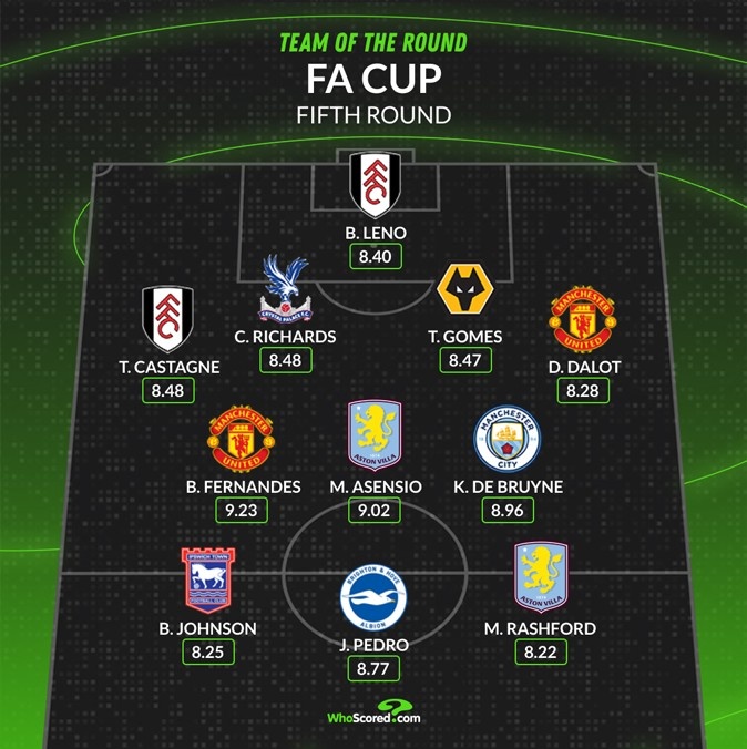 3月4日訊 足總杯十六強戰(zhàn)已經(jīng)完賽,whoscored也統(tǒng)計了本輪足總杯評分最佳陣容,富勒姆、維拉和曼聯(lián)各2人入圍。