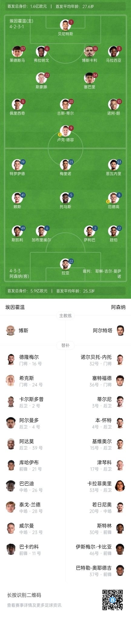 埃因霍溫首發(fā):1-沃爾特-貝尼特斯、6-弗拉明戈、18-博斯卡利、37-萊德斯馬、3-馬拉西亞、34-塞巴里、22-斯豪滕、20-古斯-蒂爾、5-佩里西奇、10-諾阿-朗、9-盧克-德容