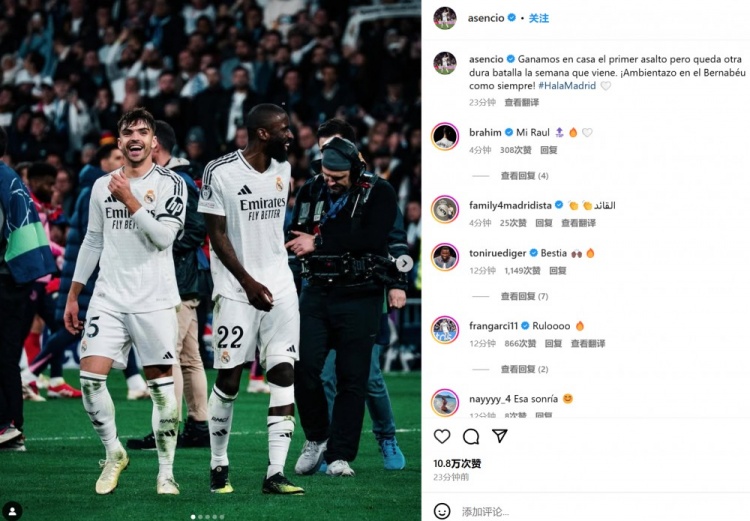 勞爾-阿森西奧配文道:“我們?cè)谥鲌?chǎng)贏下了首回合,但下周還會(huì)有一場(chǎng)鏖戰(zhàn)。伯納烏的氛圍一如既往地?zé)崃?!?/p>