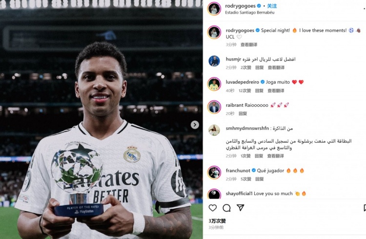 羅德里戈在賽后被歐冠官方評(píng)為本場(chǎng)最佳球員,他也通過(guò)社媒曬出自己手捧獎(jiǎng)杯的照片,并配文:“特別的夜晚!我愛(ài)這樣的時(shí)刻!??????????歐冠”