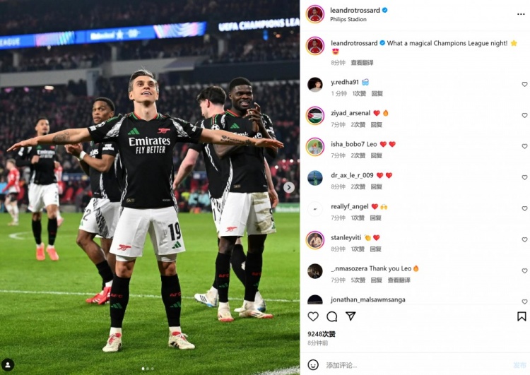本場(chǎng)比賽特羅薩德首發(fā)出戰(zhàn)并取得進(jìn)球,賽后他也在個(gè)人社媒曬出慶祝進(jìn)球照片,配文寫(xiě)道:“多么神奇的歐冠之夜!”