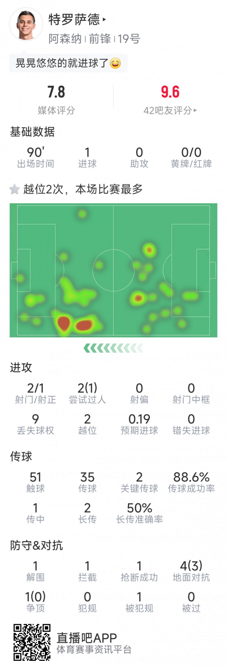 3月5日訊 在本輪歐冠阿森納7-1大勝埃因霍溫的比賽中,特羅薩德打進一球。以下為他在本場數(shù)據(jù):
