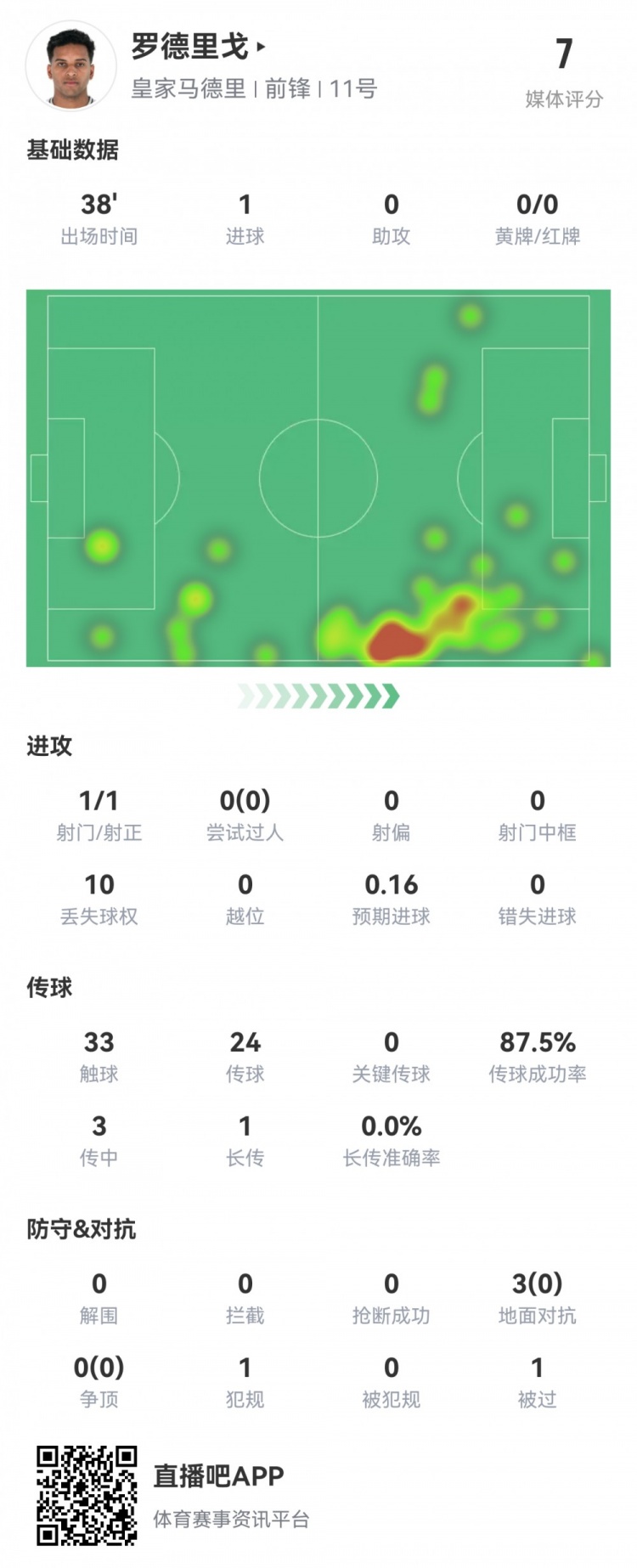 3月5日訊 正在進行的歐冠1/8決賽首回合,皇馬主場暫1-1馬競。此役羅德里戈閃擊建功,球員半場重點數(shù)據(jù)如下↓