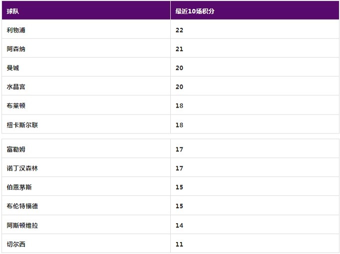 前12名球隊(duì)最近10場(chǎng)聯(lián)賽戰(zhàn)績(jī)