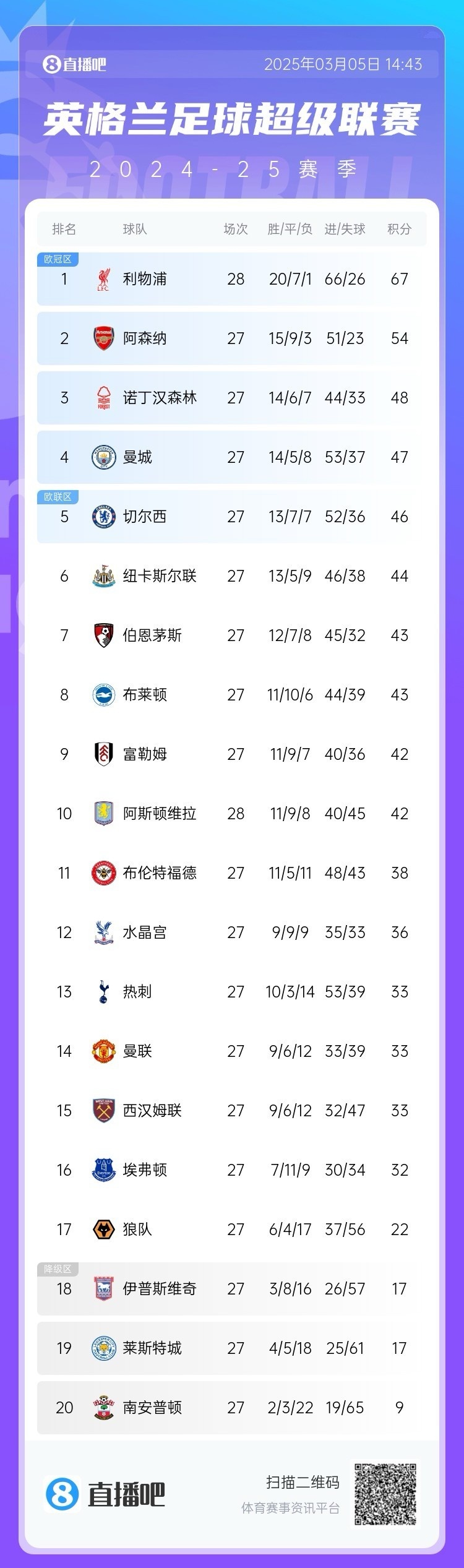 隨著2024/25賽季英超聯(lián)賽進(jìn)入最后三個(gè)月,歐戰(zhàn)資格的爭(zhēng)奪可謂是精彩紛呈。目前排名第三的諾丁漢森林與排名第十的阿斯頓維拉僅有6分差距,不過(guò)維拉多賽一場(chǎng)。