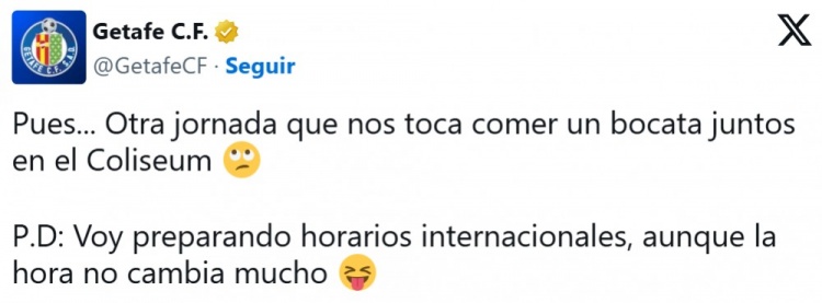 赫塔菲將于本周日下午14:00對陣馬競,而他們下個(gè)主場對陣萊加內(nèi)斯的比賽也是在下午14:00進(jìn)行。與此同時(shí),西甲聯(lián)賽宣布了第29輪的賽程,赫塔菲再次在下午14:00主場迎戰(zhàn)比利亞雷亞爾,俱樂部在社交網(wǎng)絡(luò)上調(diào)侃這一賽程。