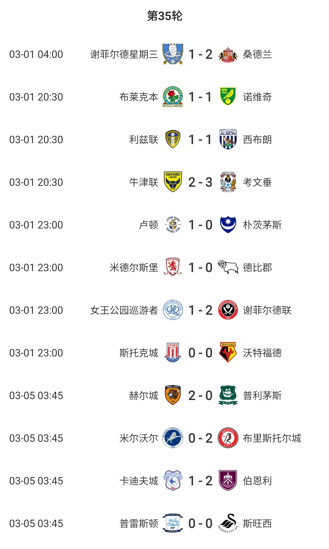 03月05日訊 英冠第35輪在北京時(shí)間今天凌晨全部結(jié)束,目前利茲聯(lián)3分領(lǐng)跑,因財(cái)務(wù)違規(guī)開(kāi)局被扣2分的謝菲爾德聯(lián)第2,伯恩利35輪僅丟10球排名第3,桑德蘭積65分位列第4,這四支球隊(duì)斷層領(lǐng)跑。