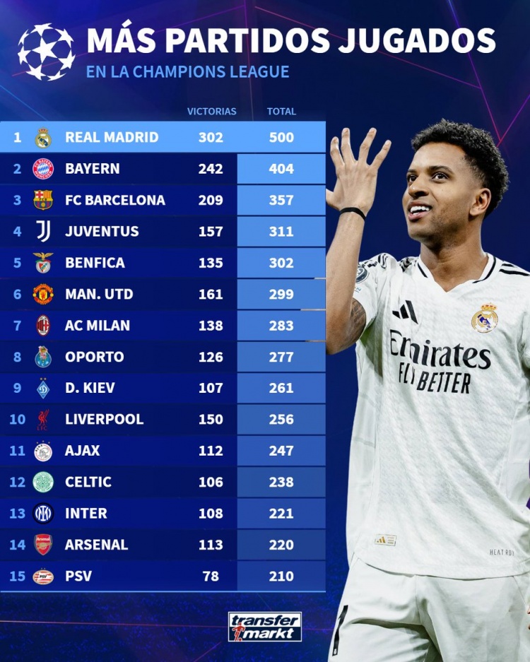 俱樂(lè)部歐冠參賽場(chǎng)次排行:皇馬500場(chǎng)居首,拜仁巴薩二三位