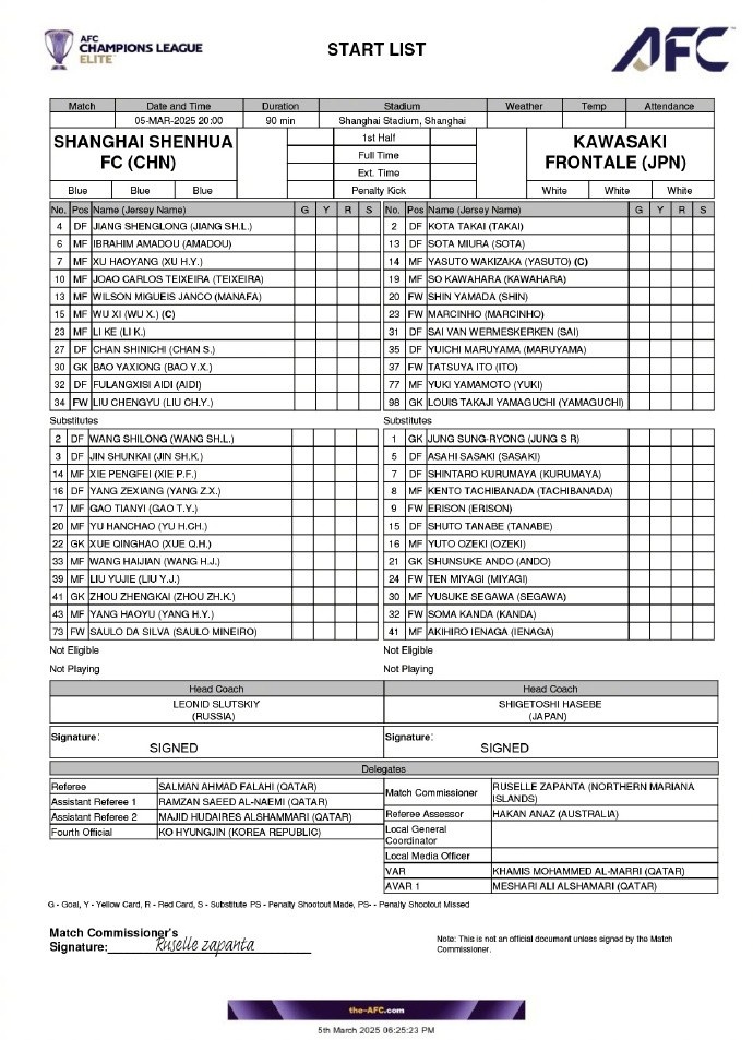 2024/25亞冠精英聯(lián)賽1/8決賽首回合 上海申花vs川崎前鋒 首發(fā)名單 ???