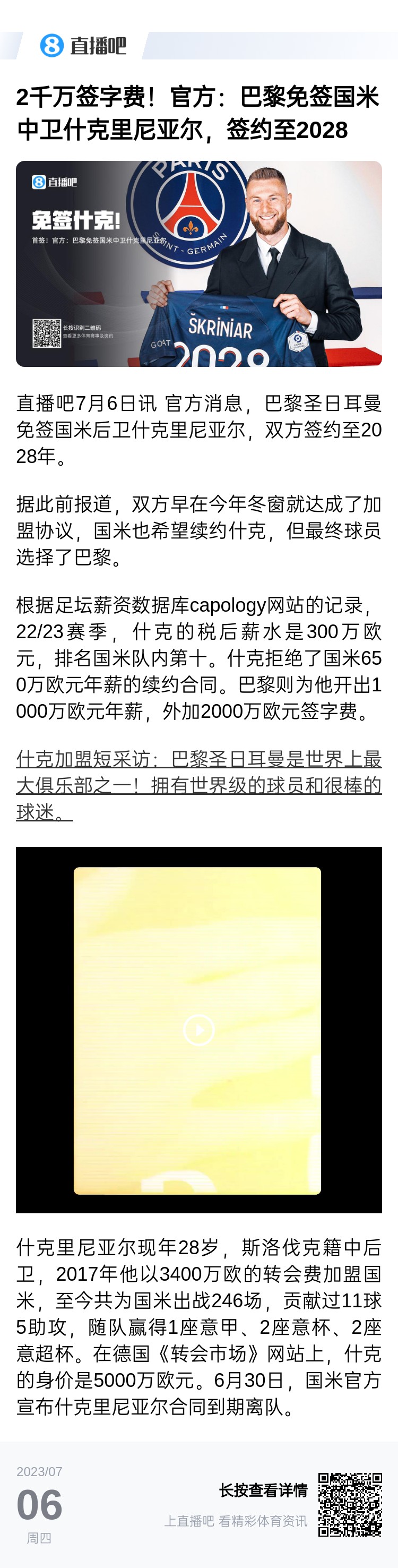 2022/23賽季,國米與當時的球隊隊長什克一直就續(xù)約問題進行拉扯,國米給出的合同是薪水翻番,從稅后年薪300萬歐漲至600萬歐,但最終巴黎為他開出了1000萬歐元年薪,外加2000萬歐元簽字費的待遇,什克從“國米隊長”變成了球迷口中的“巴黎雇傭兵”。
