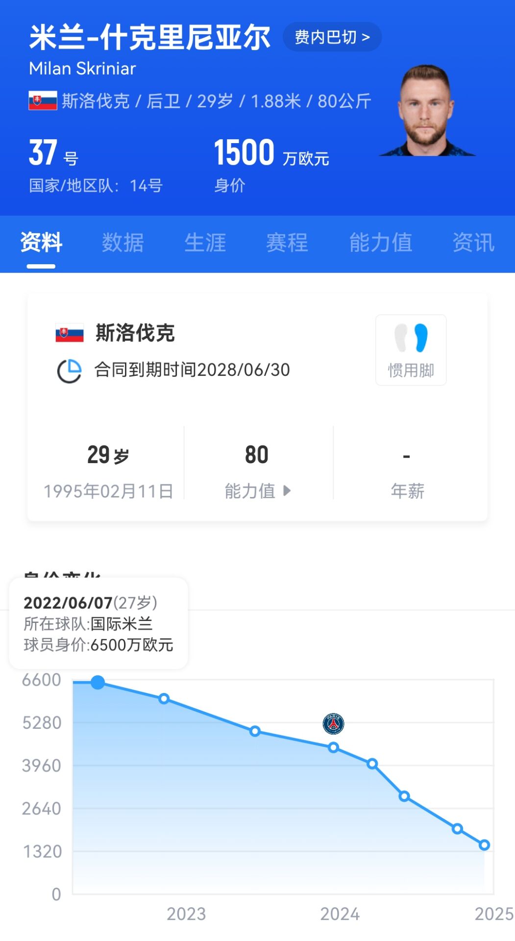 什克里尼亞爾今年29歲,本應是中衛(wèi)的黃金年齡,但在2023年自由身加盟巴黎之后,他的生涯軌跡斷崖式下滑,身價從2年半暴跌5000萬歐元,本賽季他多次被排除出巴黎陣容,總共只有5次出場。