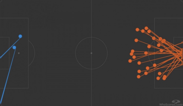 在whoscored統(tǒng)計的射門圖上,利物浦唯一的射正就進球了,另一腳踢向了角旗;巴黎的射門則是密密麻麻……
