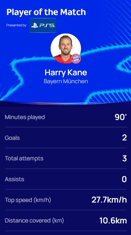 本場比賽凱恩梅開二度,3次射門,跑動距離10.6km,賽后他也當選歐冠官方評選的本場最佳球員。