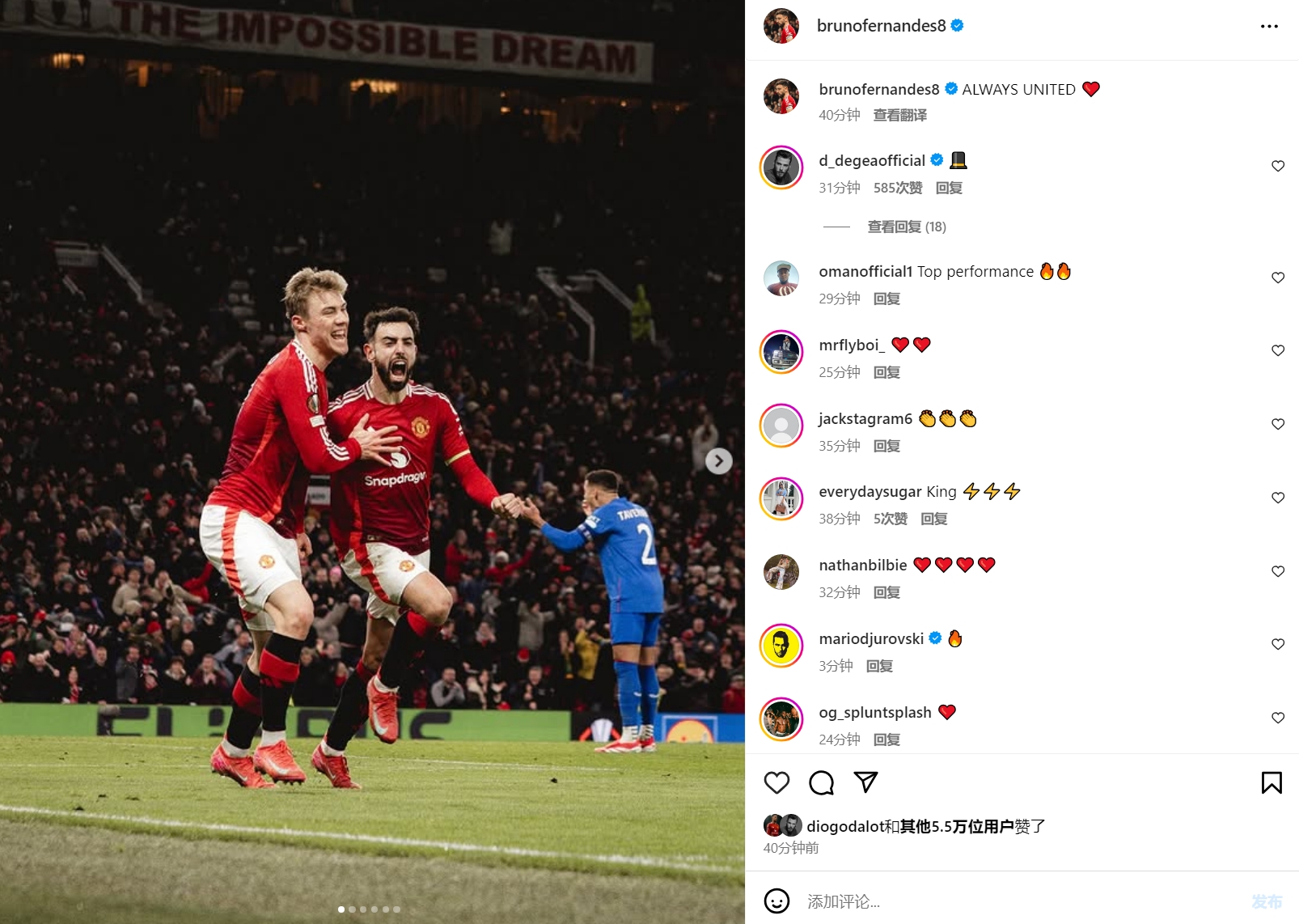 B費(fèi)在社交媒體上曬出慶祝進(jìn)球的照片,配文:“永遠(yuǎn)團(tuán)結(jié)一致?!保p關(guān)永遠(yuǎn)曼聯(lián))