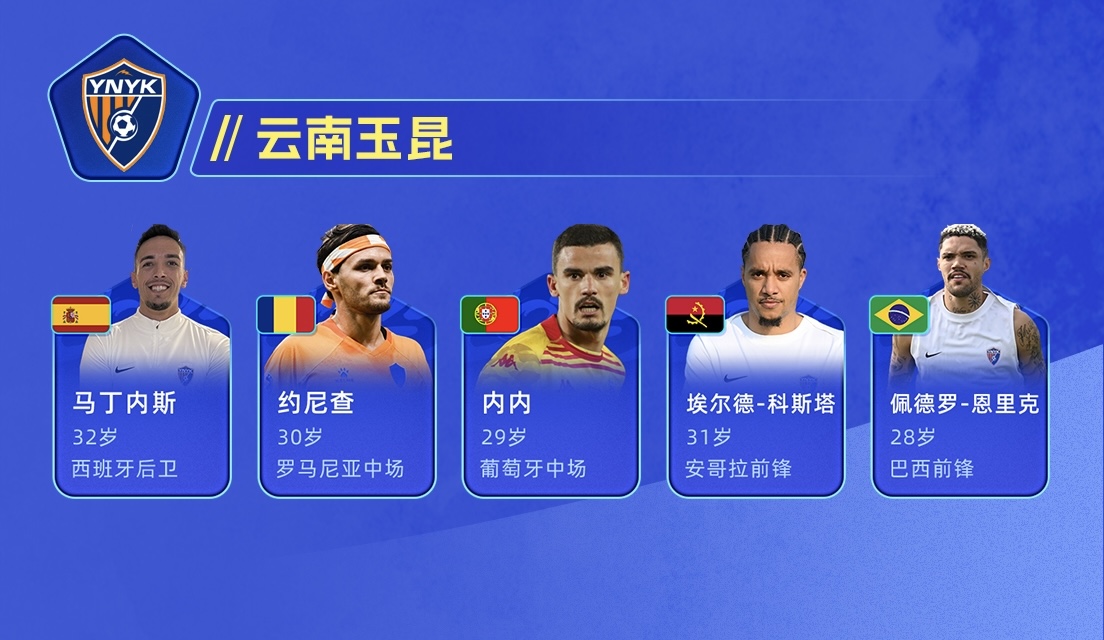 目前云南玉昆的外援有馬丁內(nèi)斯、約尼查、內(nèi)內(nèi)、佩德羅-恩里克以及埃爾德-科斯塔,其中馬丁內(nèi)斯、約尼查、內(nèi)內(nèi)、佩德羅-恩里克,四人都代表云南玉昆參加了前兩輪中超比賽,只有埃爾德-科斯塔還未出場(chǎng)。