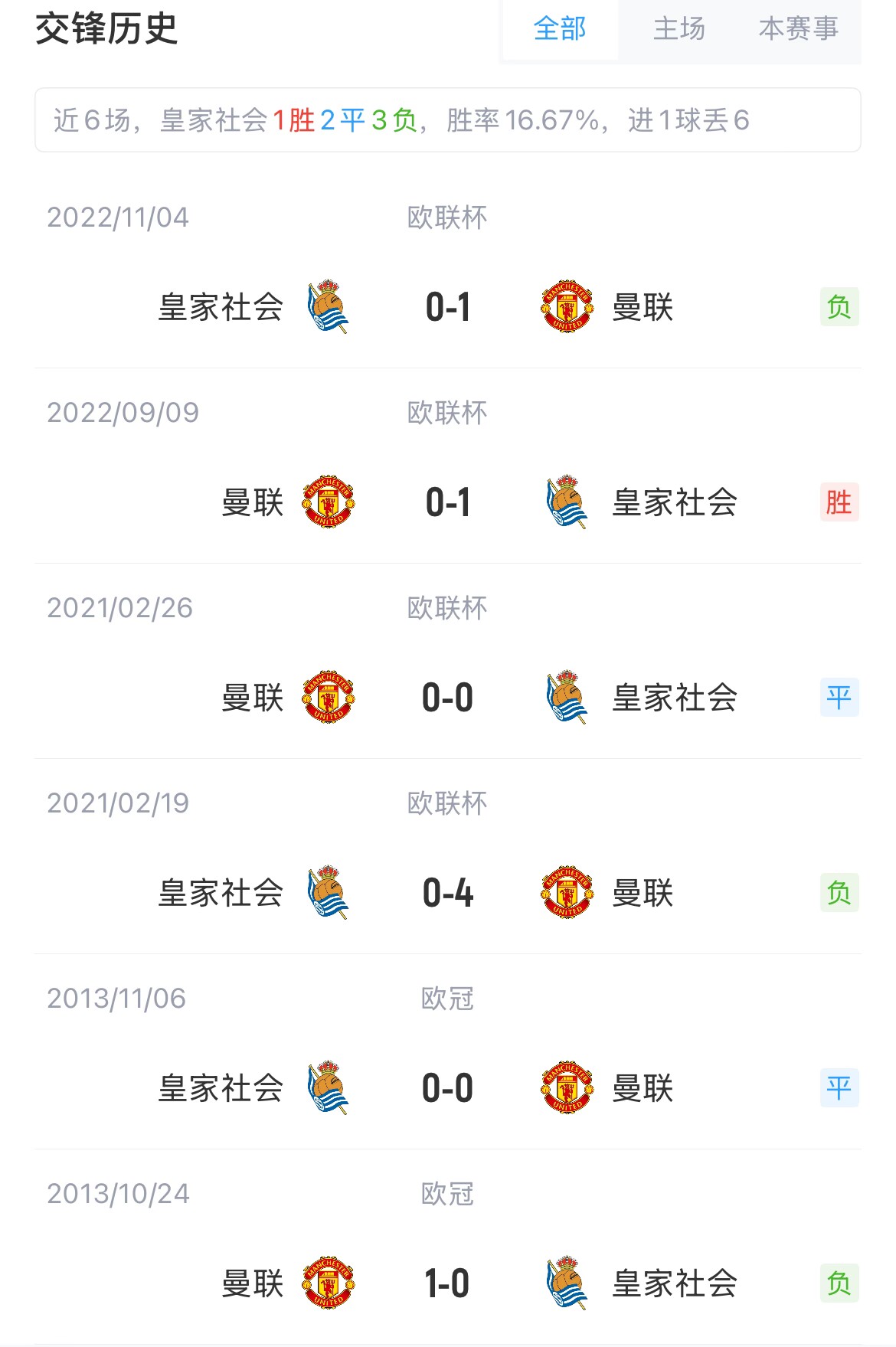 曼聯(lián)與皇家社會共交手過6次,曼聯(lián)3勝2平1負。此外,本賽季歐聯(lián)杯,曼聯(lián)目前是唯一一支不敗球隊,他們聯(lián)賽階段5勝3平。