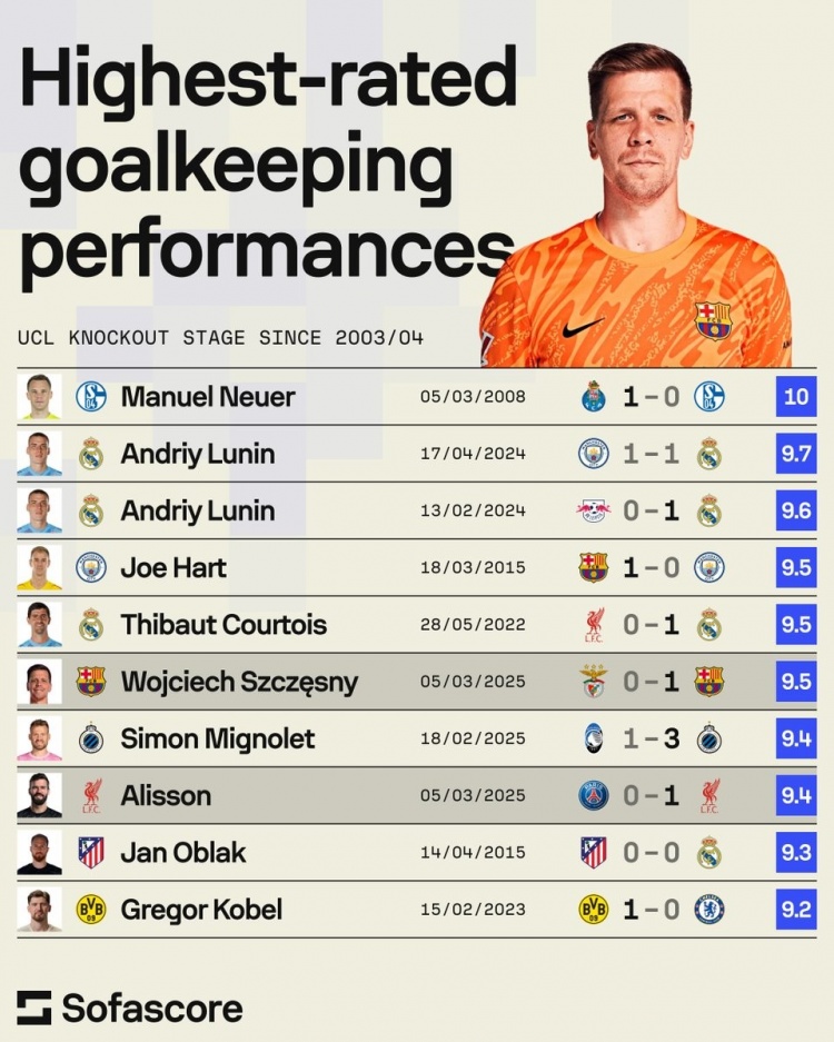 sofascore歐冠淘汰賽歷史門將評分榜:03-04賽季以來有統(tǒng)計(jì)