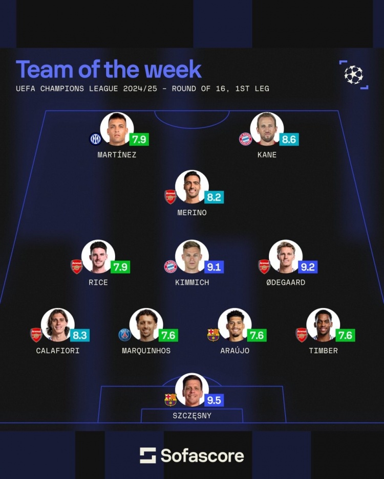 sofascore本輪歐冠最佳陣:厄德高領(lǐng)銜槍手5將,基米希、3C在列