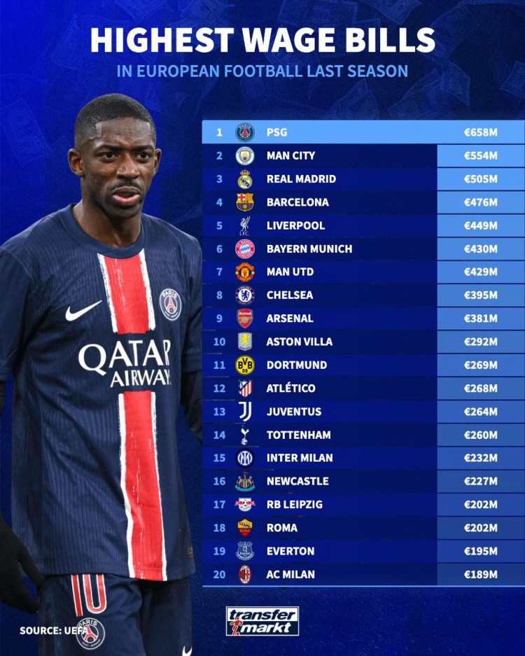 德轉(zhuǎn)列上賽季豪門薪資榜:巴黎6.58億歐,城皇薩軍仁魔車槍列前9