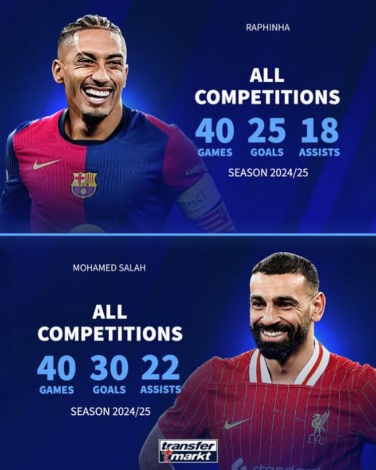 拉菲尼亞本賽季為巴薩各項賽事出戰(zhàn)40場,貢獻(xiàn)25球18助攻。