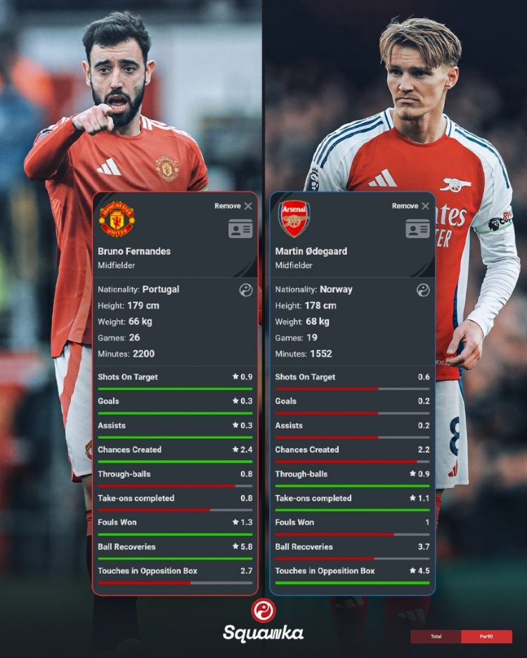 3月8日訊 曼聯(lián)將在本輪英超迎戰(zhàn)阿森納,數(shù)據(jù)機(jī)構(gòu)squakwa也對比了兩隊核心的本賽季英超每90分鐘關(guān)鍵數(shù)據(jù),B費(fèi)在多項數(shù)據(jù)領(lǐng)先。