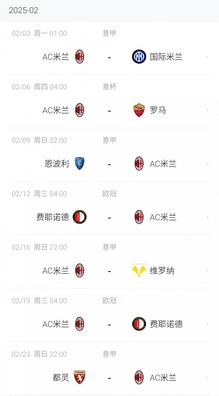 1月31日訊 歐冠附加賽抽簽結(jié)束,AC米蘭將迎戰(zhàn)費耶諾德。米蘭2月份賽程如上圖。