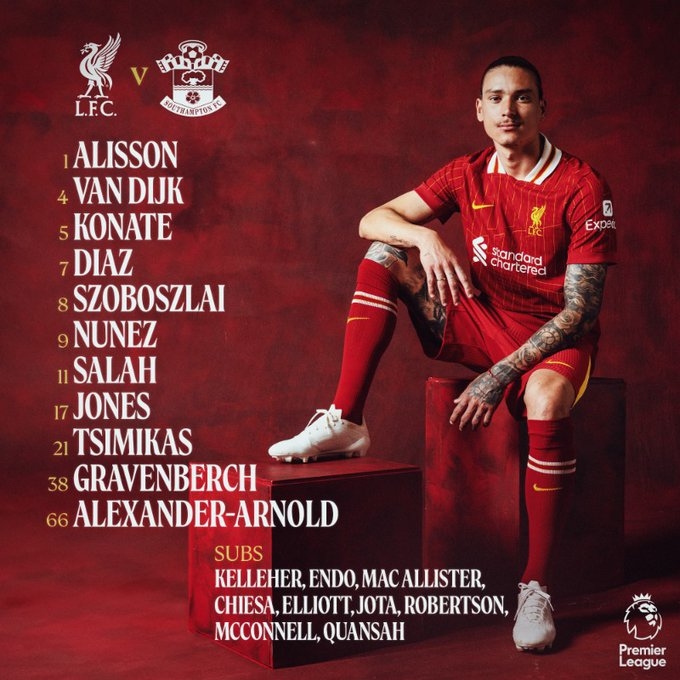 利物浦vs南安普頓首發(fā):薩拉赫領(lǐng)銜,努涅斯、索博出戰(zhàn)麥卡替補(bǔ)