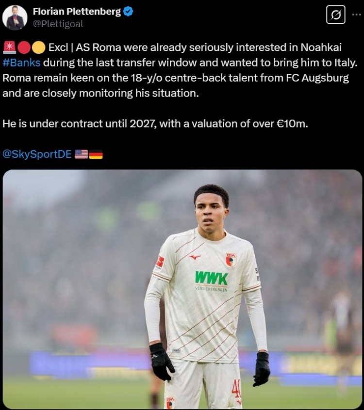 報(bào)道稱羅馬在上一個(gè)轉(zhuǎn)會(huì)窗就已經(jīng)認(rèn)真考慮引進(jìn)班克斯,球隊(duì)現(xiàn)在還一直關(guān)注著球員的情況。班克斯目前與奧格斯堡的合同將在2027年到期,預(yù)計(jì)的轉(zhuǎn)會(huì)身價(jià)超過(guò)1000萬(wàn)歐。