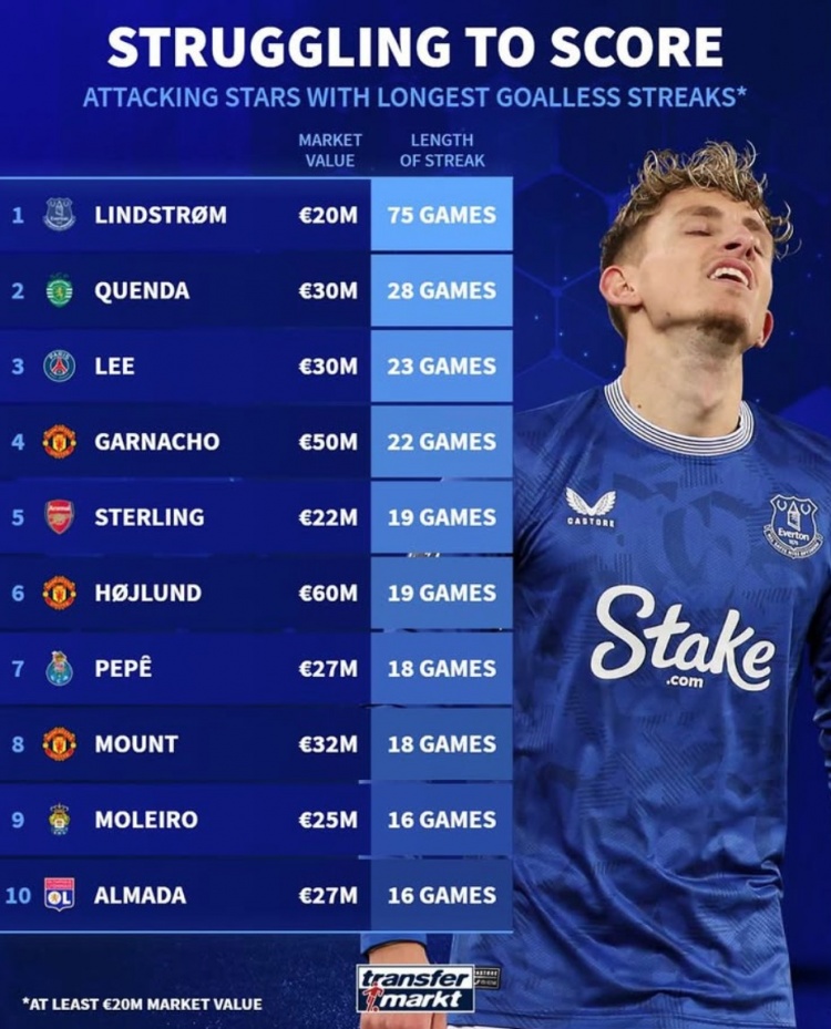 3月8日訊 《轉(zhuǎn)會市場》統(tǒng)計了當前身價超過2000萬歐元的攻擊手當前進球荒情況,林德斯特倫斷崖式居首。