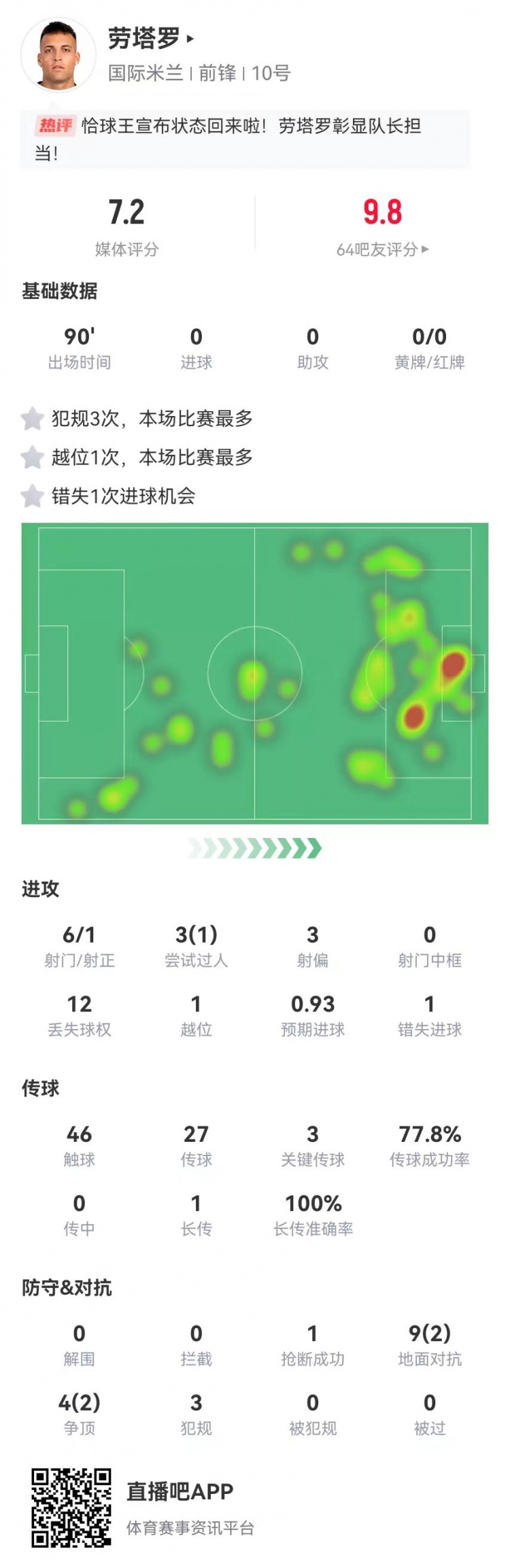 勞塔羅本場數(shù)據(jù):6射1正+1失良機 3關鍵傳球+3犯規(guī) 13對抗4成功