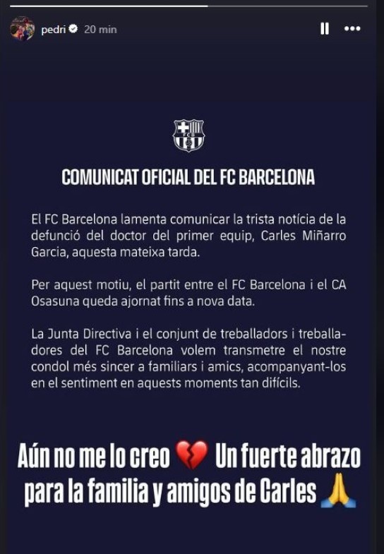 3月9日訊 今天凌晨,巴塞羅那俱樂(lè)部宣布一線隊(duì)隊(duì)醫(yī)卡萊斯-米尼亞羅-加西亞不幸離世,而球隊(duì)原定于北京時(shí)間凌晨4:00對(duì)陣奧薩蘇納的比賽也被推遲。