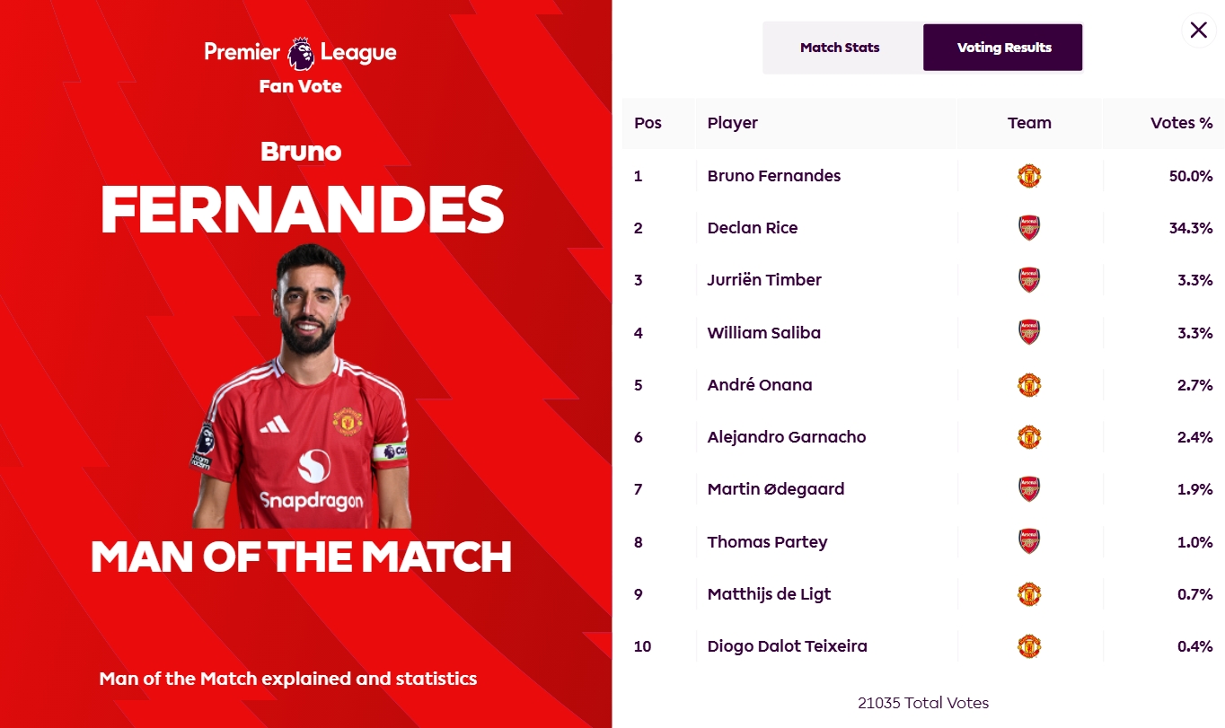 本場比賽,B費(fèi)打入一個(gè)任意球世界波,為曼聯(lián)首開記錄,賽后他獲得50%的票數(shù),被評(píng)為全場最佳。