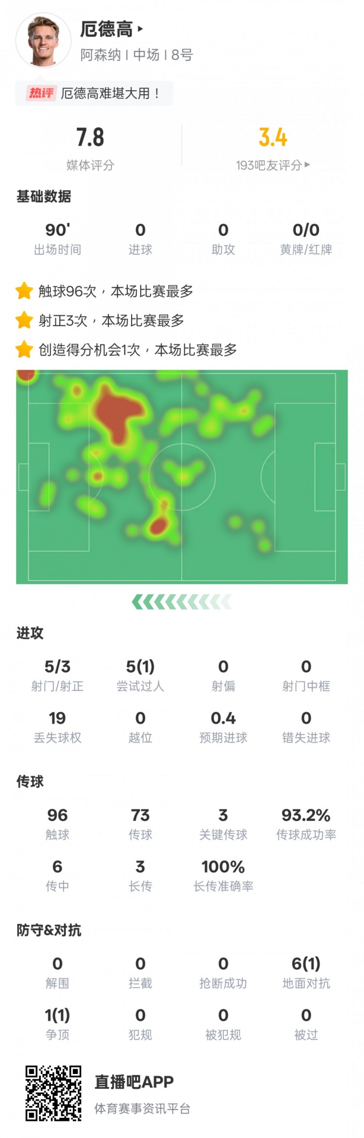 厄德高本場(chǎng)數(shù)據(jù):3關(guān)鍵傳球&創(chuàng)造1次進(jìn)球機(jī)會(huì),評(píng)分7.8
