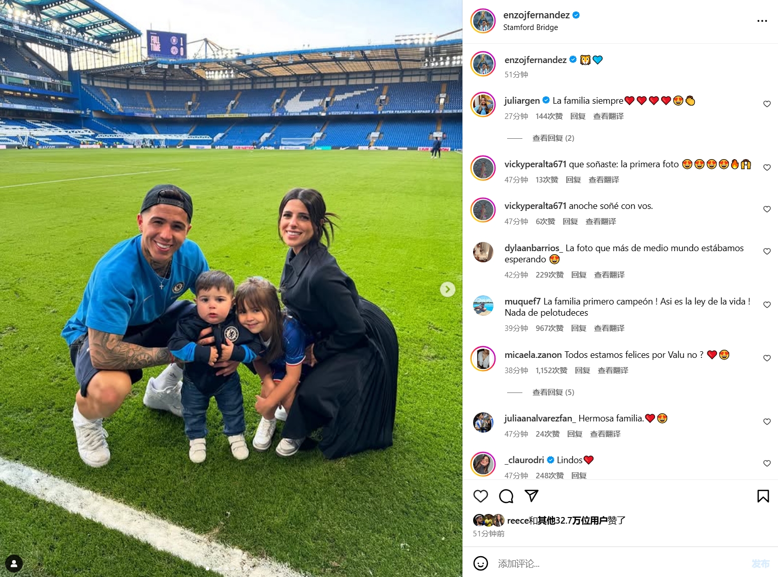 此前恩佐曾與瓦倫蒂娜分居,但隨后兩人又重新在一起,今天,恩佐就曬出了兩人與倆孩子在切爾西主場的合照,看起來滿臉幸福。