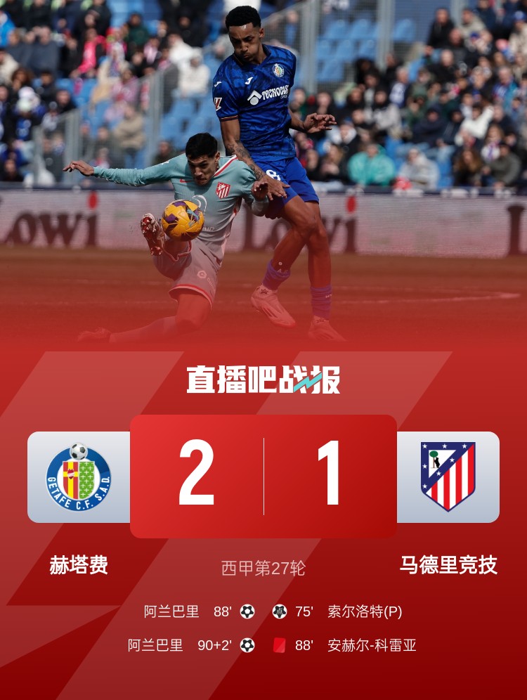 馬競1-2不敵赫塔費,科雷亞第88分鐘染紅,馬競錯失登頂機(jī)會!