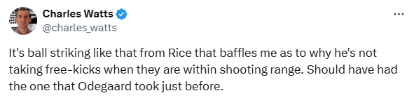 在賴斯進球后,阿森納系的記者Charles Watts在社媒表示:“賴斯這樣的射門讓我困惑了,為什么獲得射程范圍以內(nèi)的任意球時不讓他去主罰呢?之前厄德高主罰的那個任意球應(yīng)該讓他去踢?!?/p>