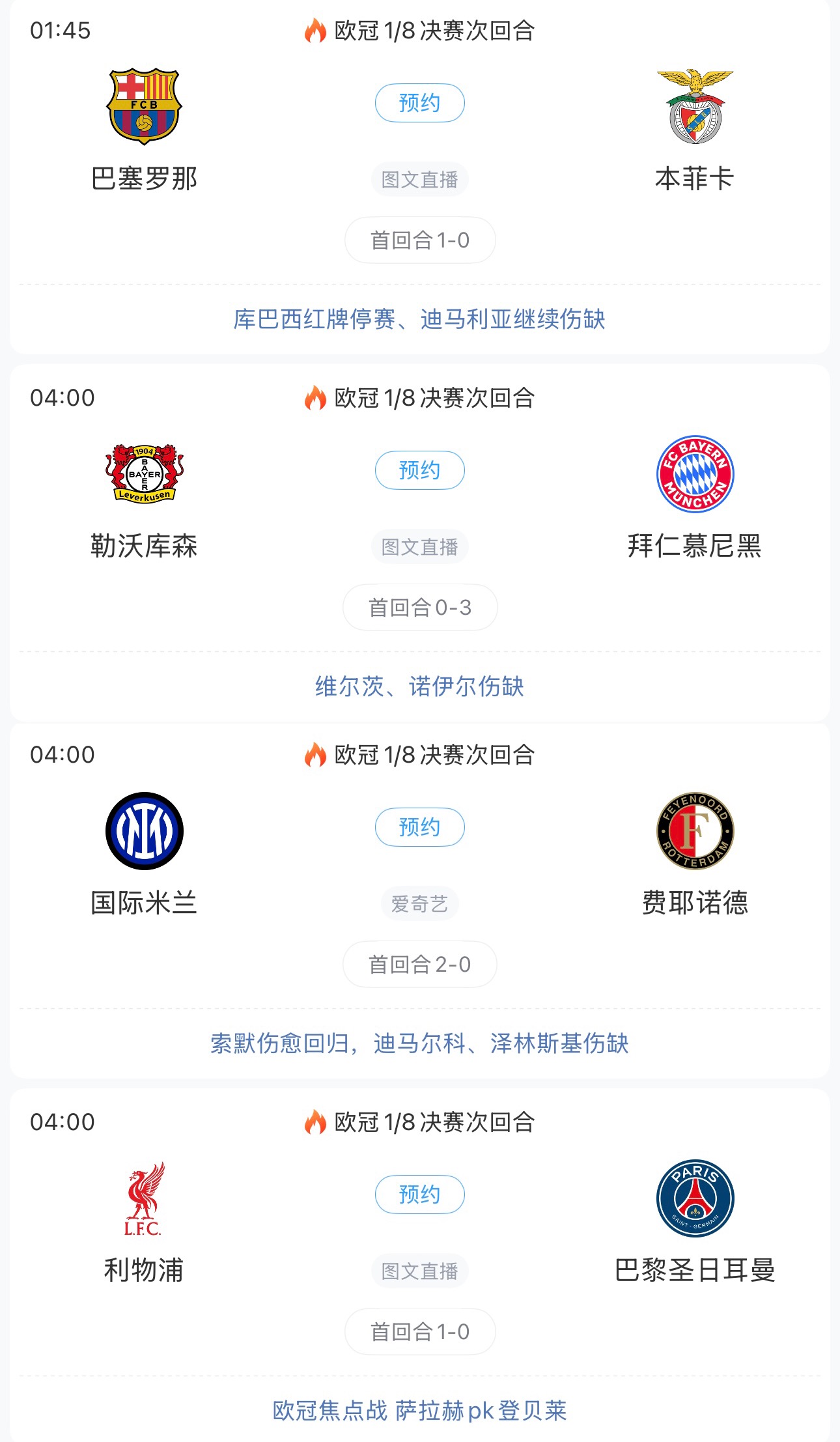 北京時間明天凌晨,歐冠1/8決賽次回合開打,利物浦大戰(zhàn)巴黎,薩拉赫與登貝萊繼續(xù)“金球之爭”,拜仁與勒沃庫森上演德甲內(nèi)戰(zhàn),巴薩、國米出戰(zhàn)。四組對陣中會不會出現(xiàn)逆轉(zhuǎn)?今晚拭目以待!