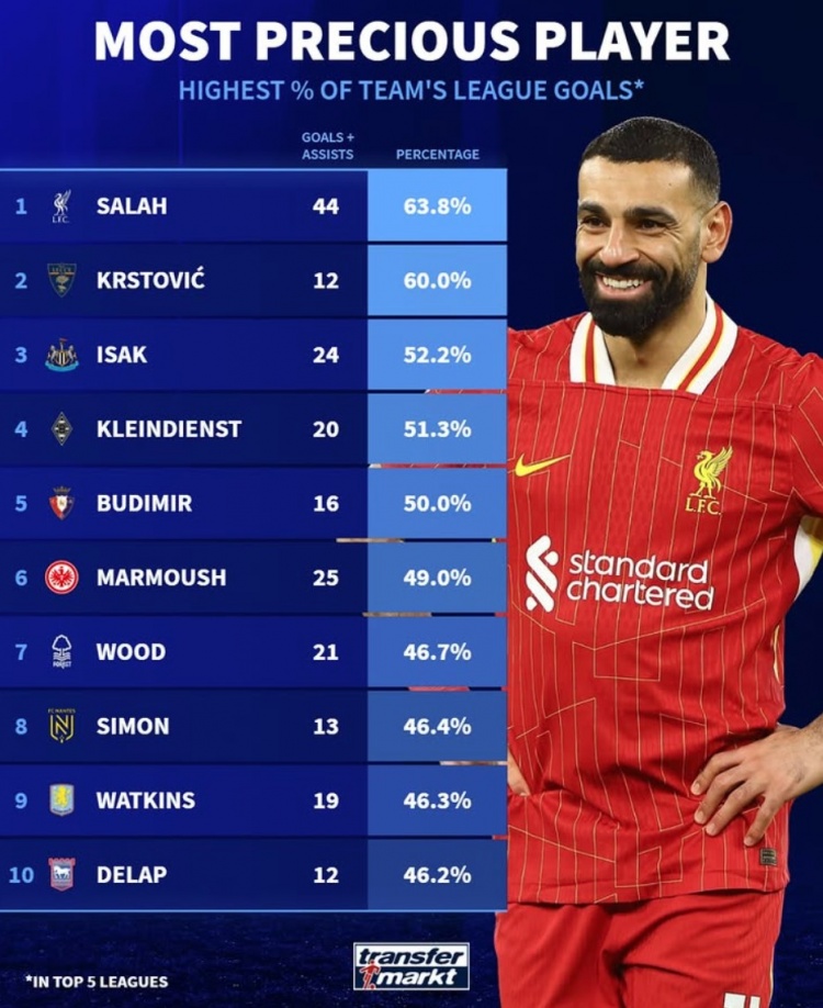 本賽季參與全隊進球比率:薩拉赫63.8%居首,伊薩克&馬爾穆什在列