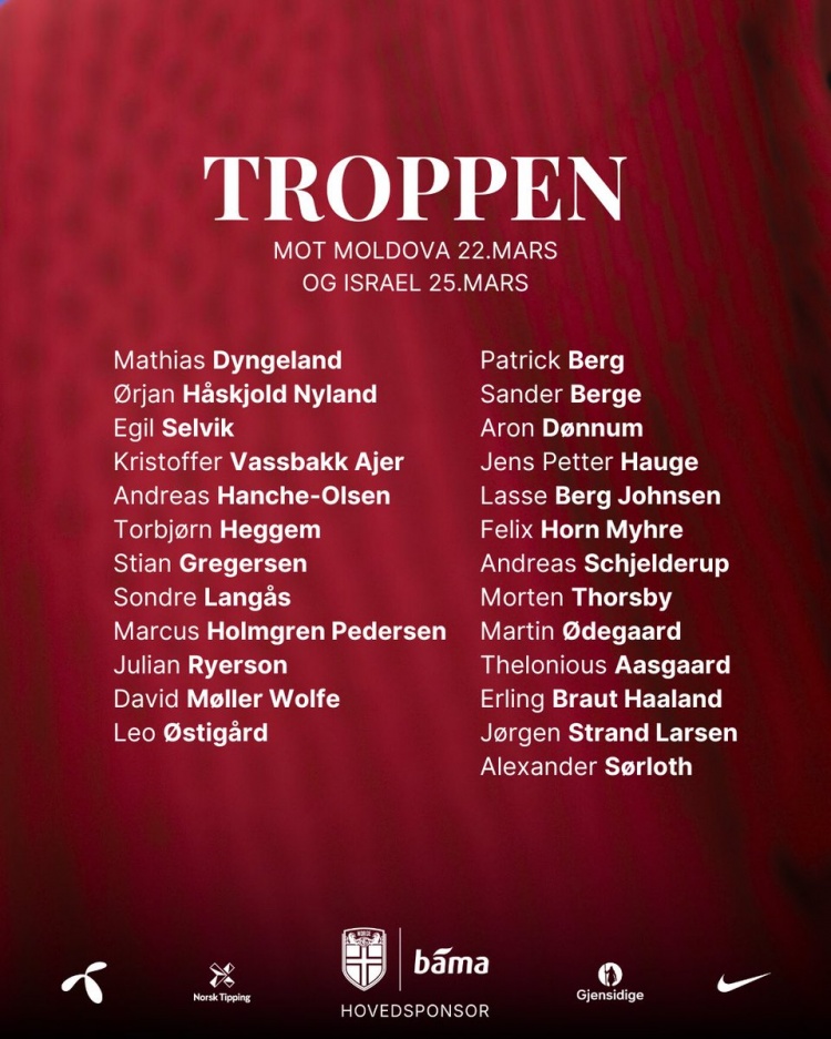 3月11日訊 挪威公布新一期國家隊大名單,哈蘭德、厄德高、索爾洛特在列。