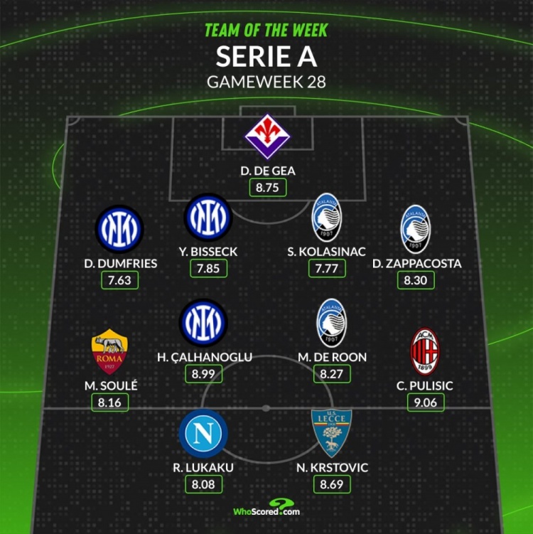 whoscored意甲本輪最佳陣:恰20領(lǐng)銜 德赫亞&普利西奇&盧卡庫在列