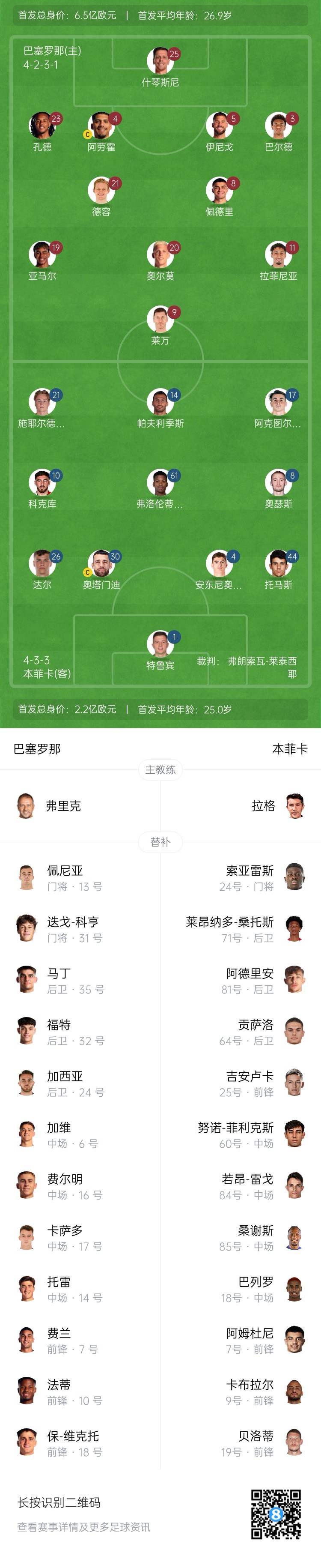 巴薩首發(fā):25-什琴斯尼、3-巴爾德、4-阿勞霍、5-伊尼戈-馬丁內斯、23-孔德、21-德容、8-佩德里、20-奧爾莫、19-亞馬爾、11-拉菲尼亞、9-萊萬
