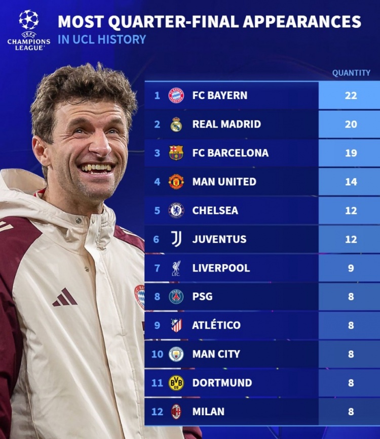 3月11日訊 歐冠十六強戰(zhàn)即將戰(zhàn)火重燃,《轉會市場》也列出了改制后歐冠晉級八強次數(shù)情況,拜仁、皇馬、巴薩分列前三。